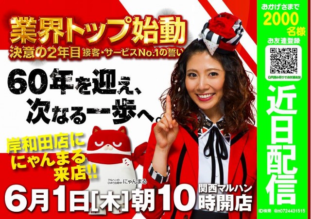 本日、6月1日 にゃんまる来店!【業界トップ始動】岸和田店
