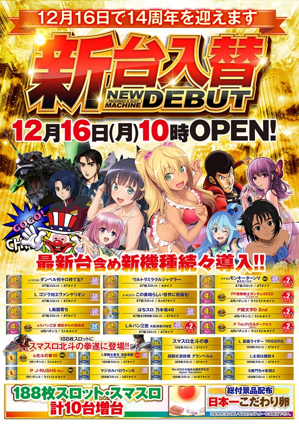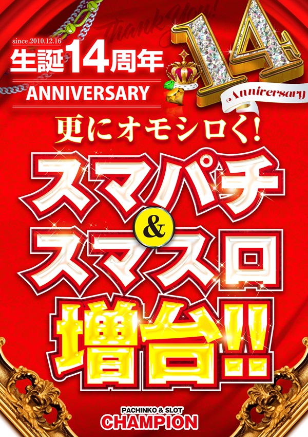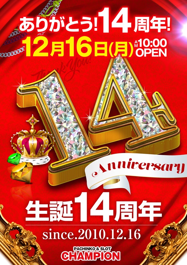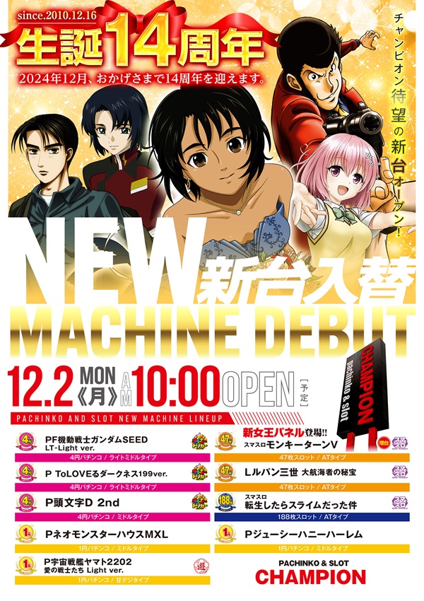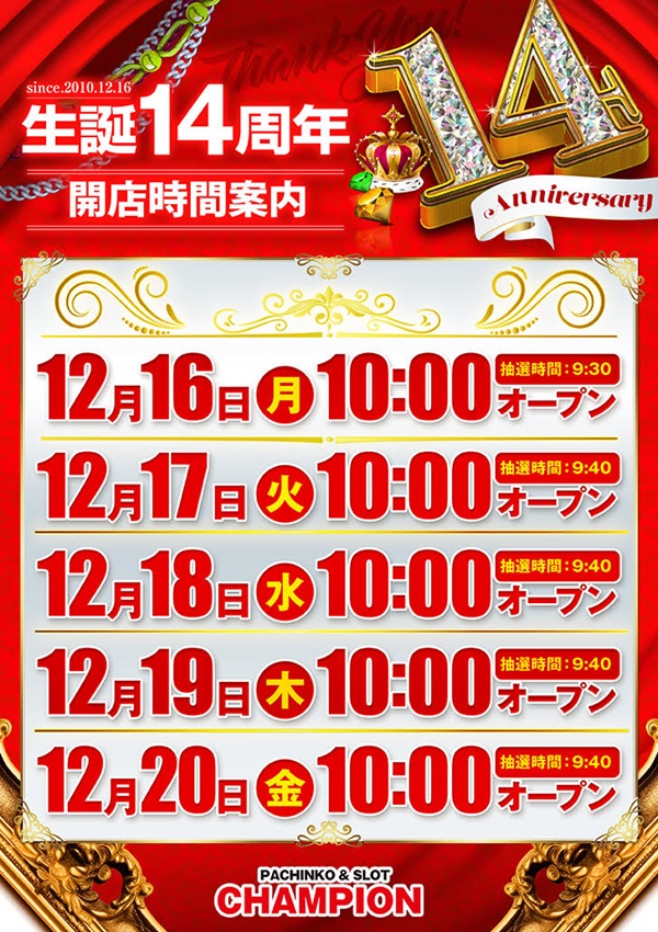 CHAMPION12月16日14周年新台入替10時開店予定
