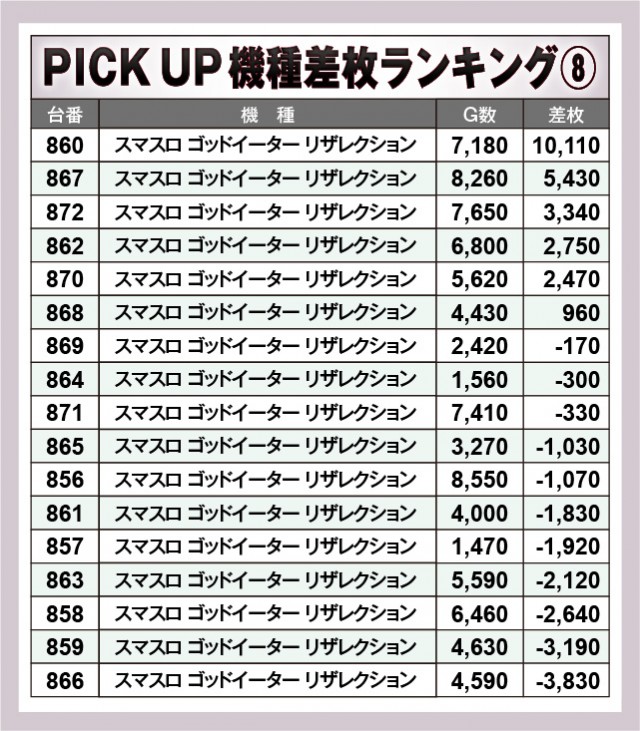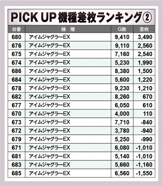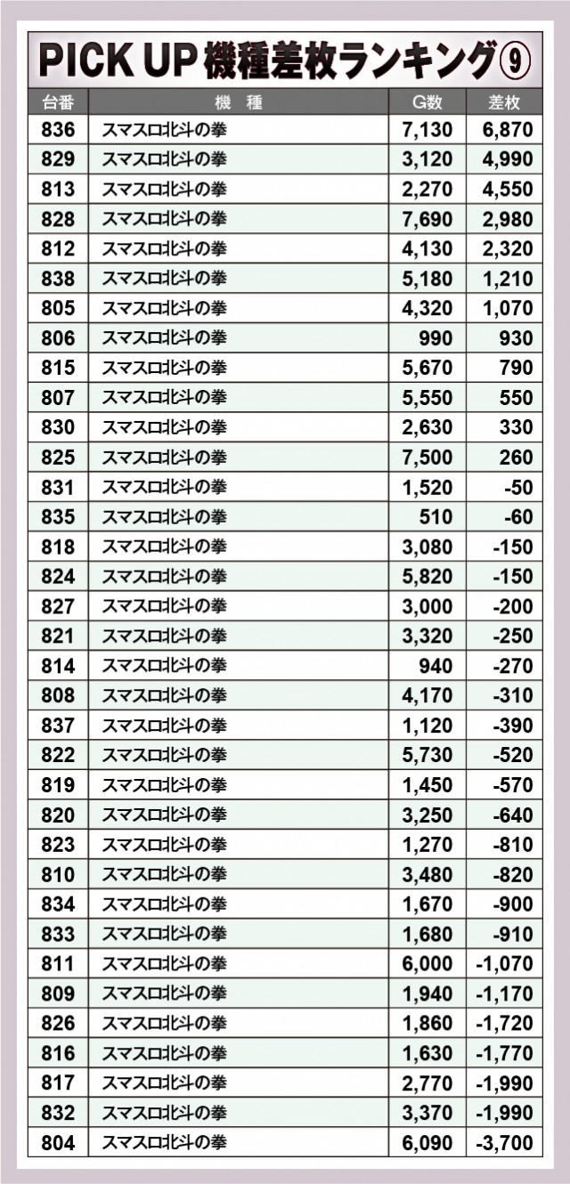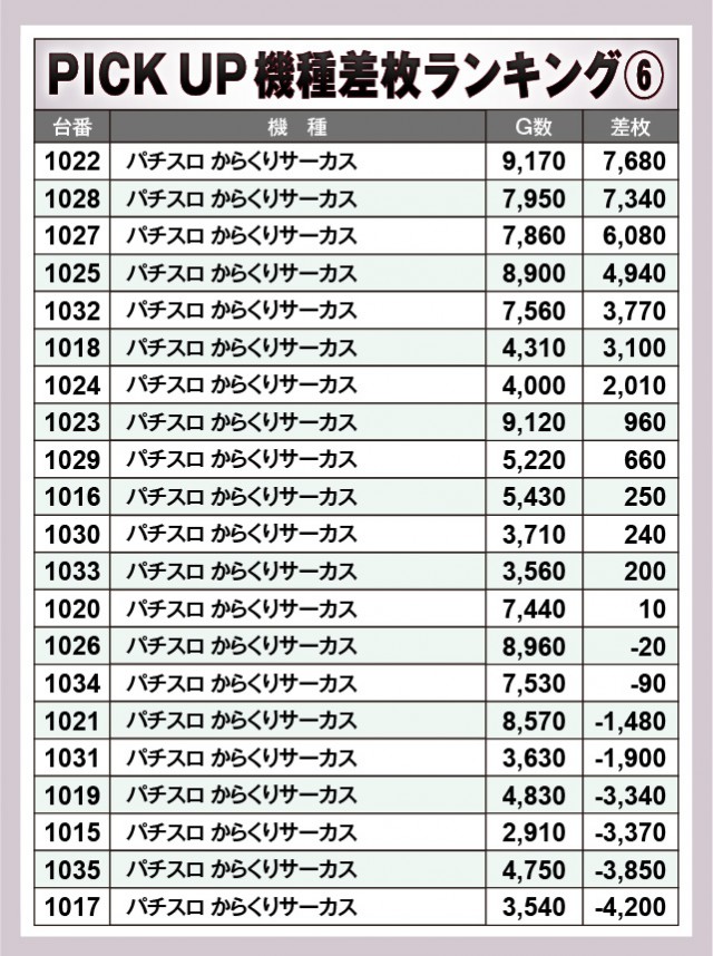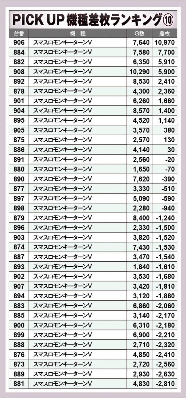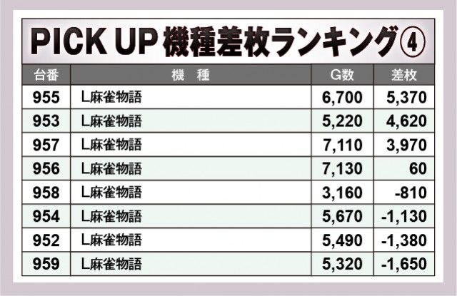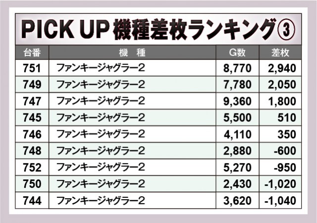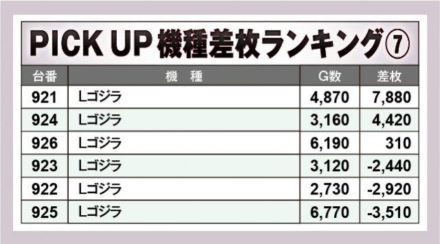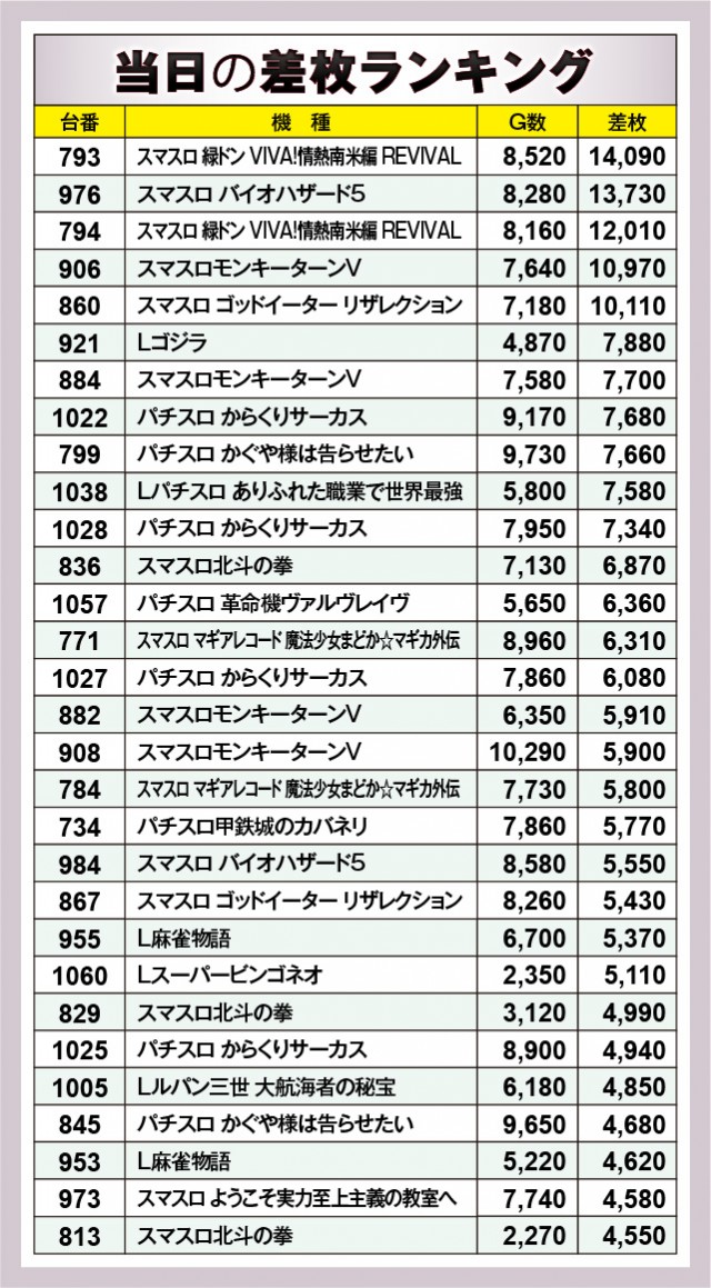 万枚OVERを達成した4機種が優秀機種として大きな存在感を放ち、遊技するファンは嬉々としてレバーを叩いていたことだろう。そして『L麻雀物語』『パチスロ からくりサーカス』『Lゴジラ』『スマスロ北斗の拳』も大台突破を果たしており、これらが盛り上がりの中心地になっていたと言える。『ジャグラー』も回転数と差枚数が比例する展開を披露しており、ファンは笑顔を覗かせていたのも見逃せない。