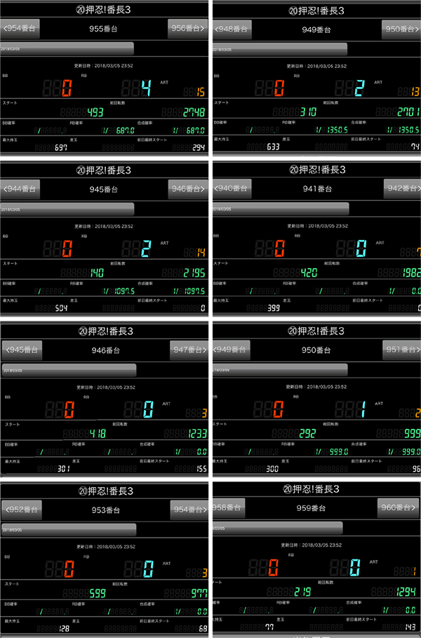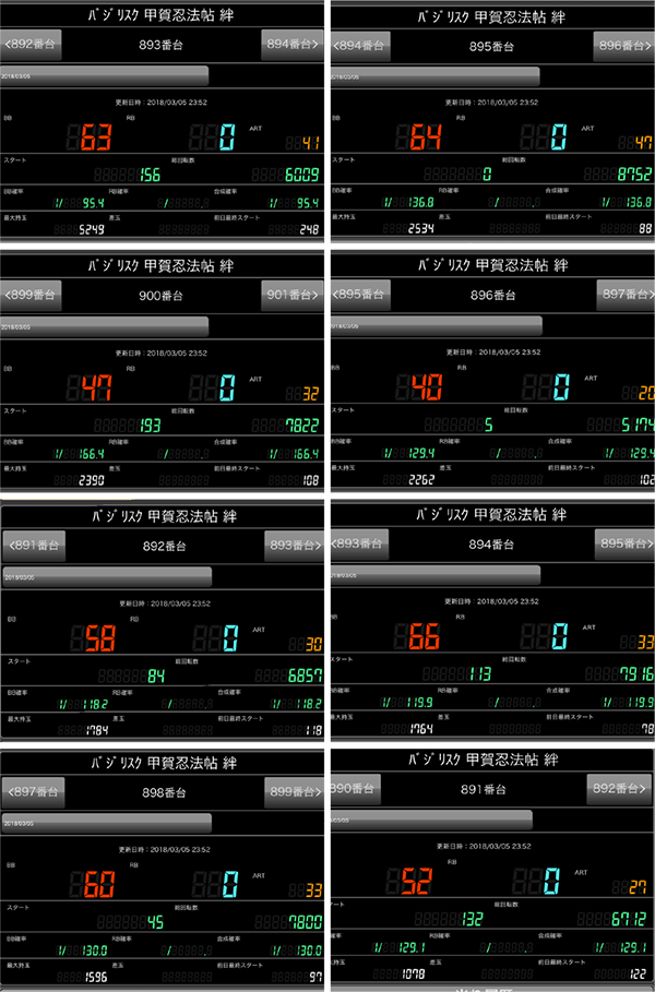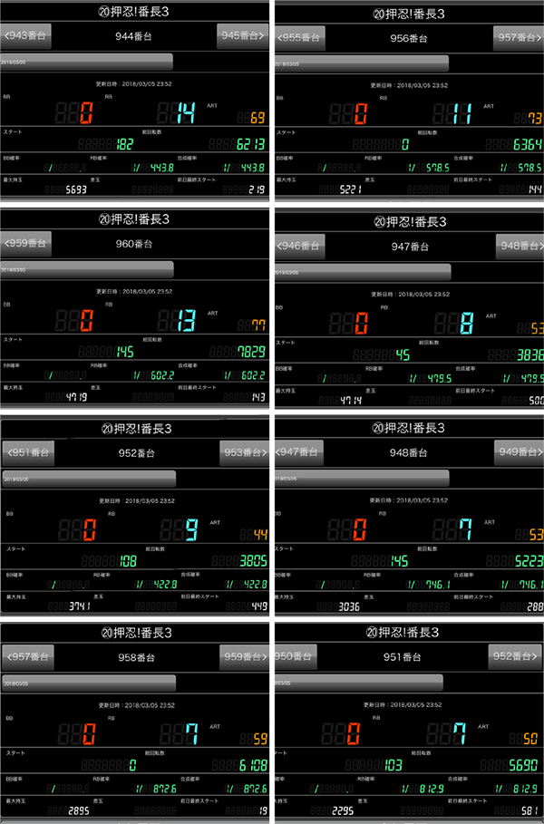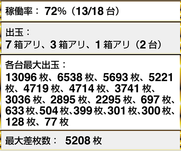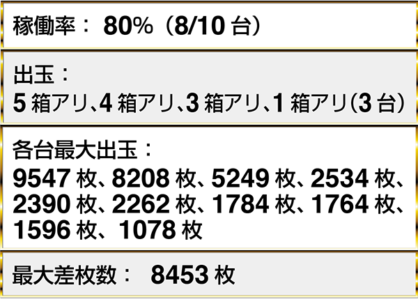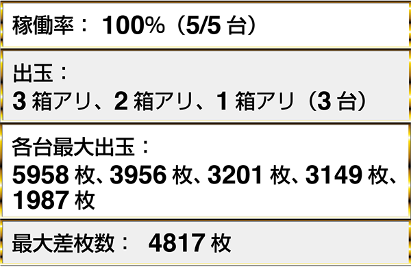 『バジリスク~甲賀忍法帖~絆』と『SLOT魔法少女まどか☆マギカ』、『押忍!番長3』の3機種だけでみても、15名を超えるプレイヤーが1箱以上の出玉を獲得していた。