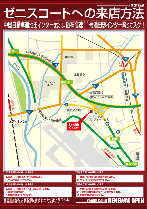 中国自動車道池田インターまたは、阪神高速11号池田線池田インター降りてすぐ。カーナビでお越しの方は、上記の住所をご入力下さい。 |