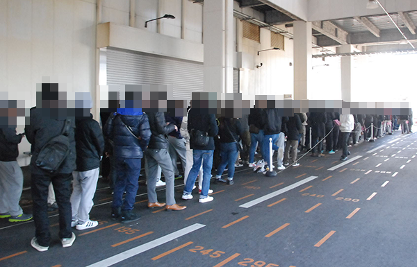 開店前に集まったプレイヤーは、およそ170名。整列場所にできた長い列からも、ホールに対する信頼の大きさがうかがえた。
