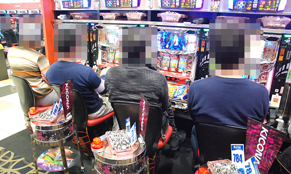 パチスロをみると、「バジリスク~甲賀忍法帖~絆」や「押忍!サラリーマン番長」など、多数の機種が満席となっていた。