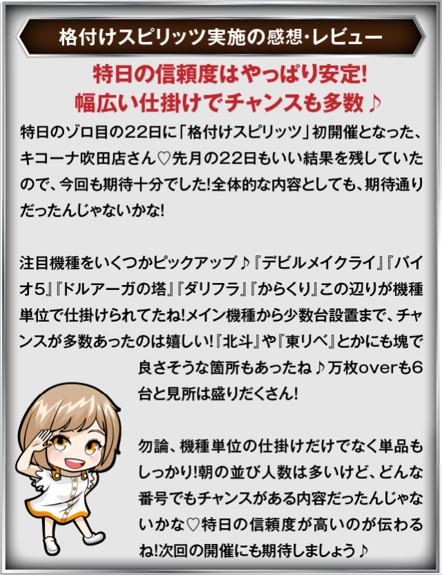 9月22日(月) キコーナ吹田店にて、DMMぱちタウンの「格付けスピリッツ」を実施。