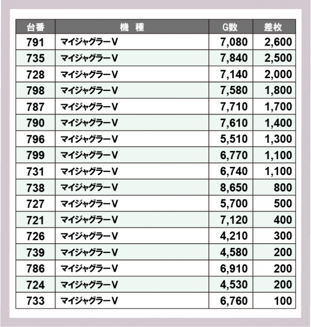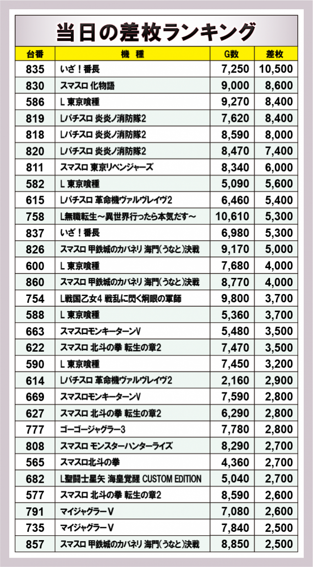 ※差枚数順に掲載しています