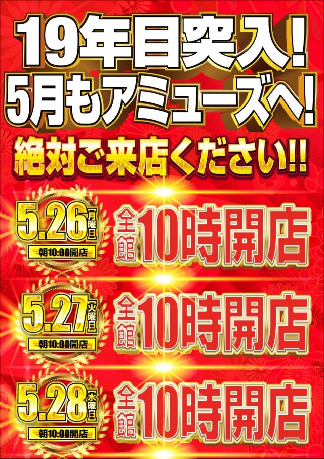 5月26日(月)アミューズ吹田岸辺店10時OPEN連日10時開店