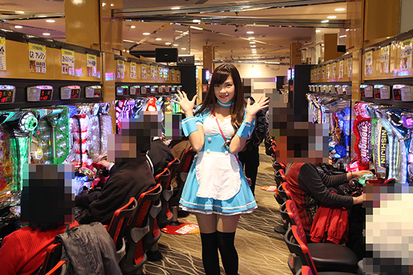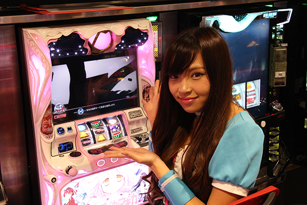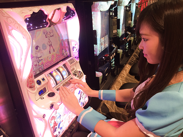 真剣な表情でリールを見つめる玲香ちゃん。目押し力は成長途中の模様で7がなかなか揃えられないことも…そんなときに、お客さまから応援を頂く場面もありました!