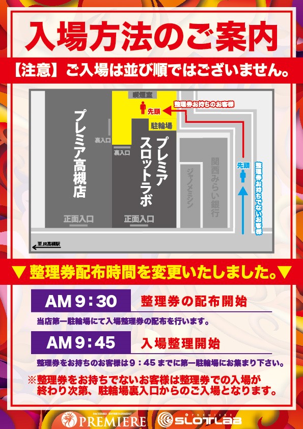 9時40分に整理券を配布致します。新台入替や混雑時等は時間帯変更アリ |