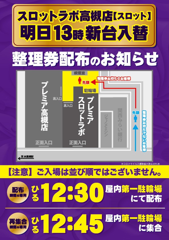 9時40分に整理券を配布致します。新台入替や混雑時等は時間帯変更アリ |
