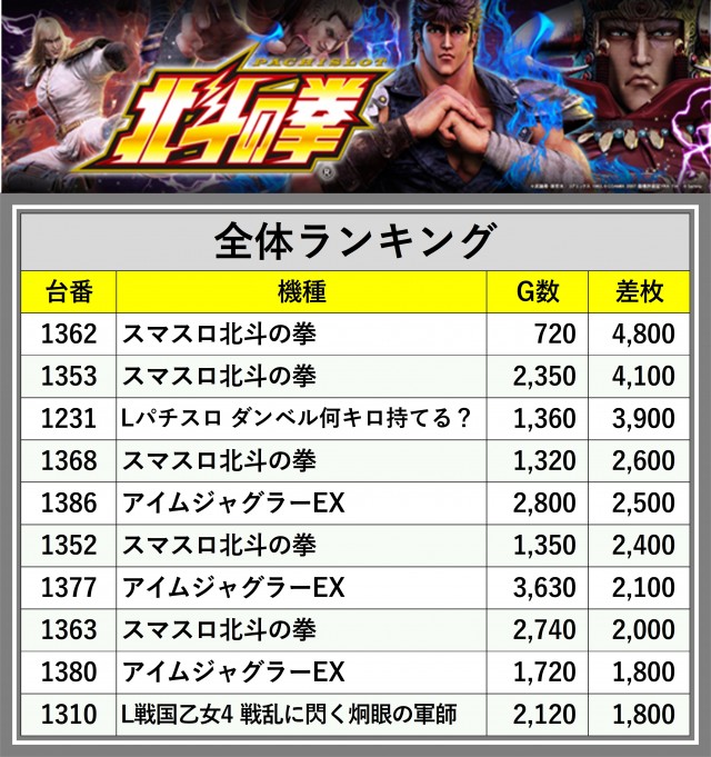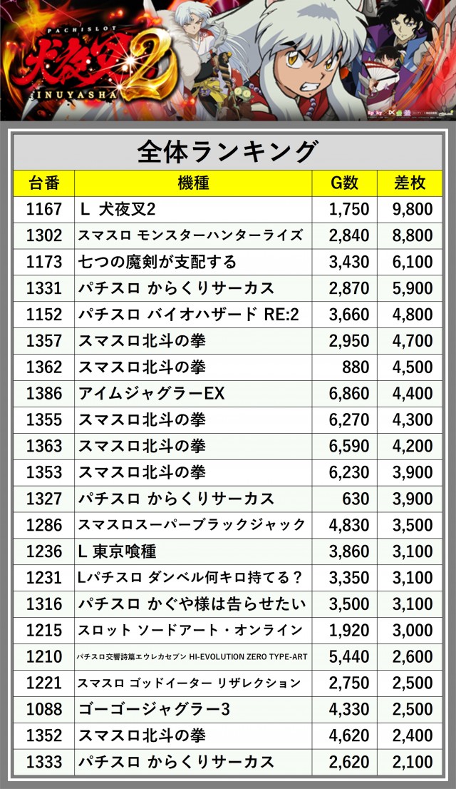 ※差枚数順に掲載しています