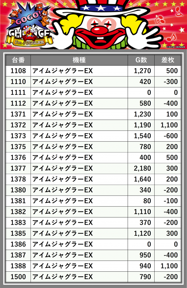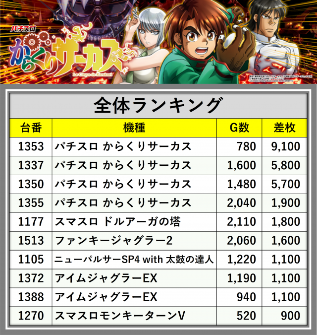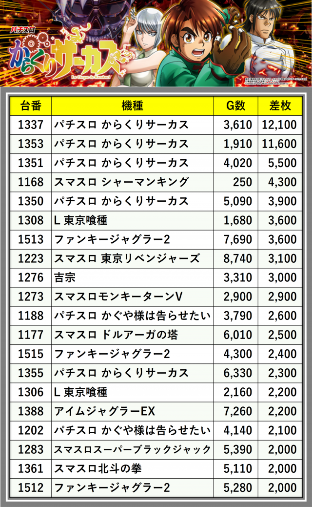 厳選された取材対象機種をはじめ、その他スロット全体から好記録が飛び出した!プレイヤーが楽しんだ1日を下記データにて振り返ってみて欲しい。
