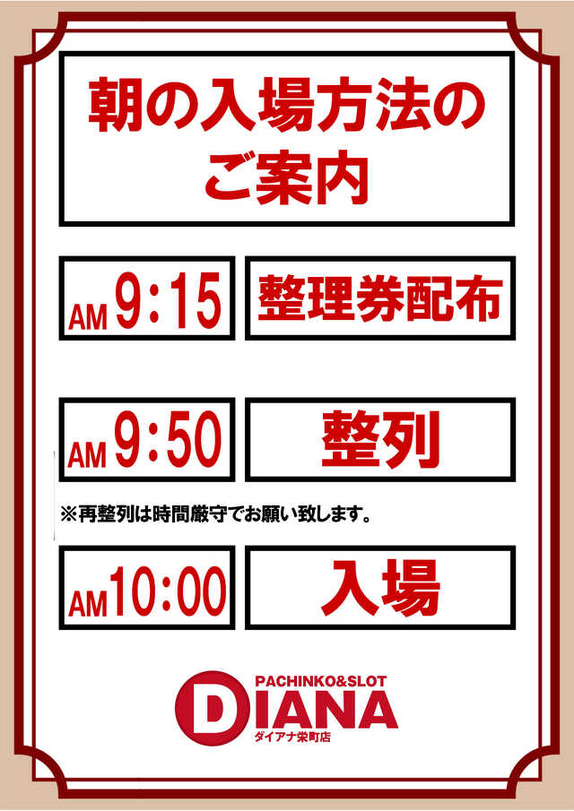 9時15分からお並びのお客様に順番に入場整理券を9時50分まで配布しております(^o^)/※再集合は9時50分です |