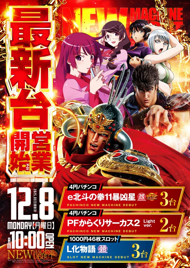 新台打つならキコーナへ!12月11日(木) 10:00開店