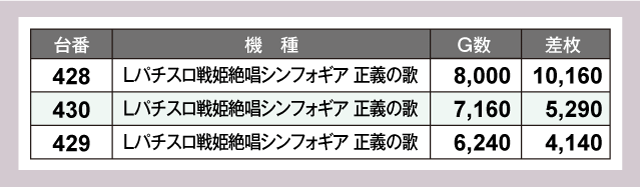 取材当日のパチスロコーナーを見てみると、『Lパチスロ戦姫絶唱シンフォギア 正義の歌』が注目を集めており、なんと428番台が万枚オーバーを達成していた。