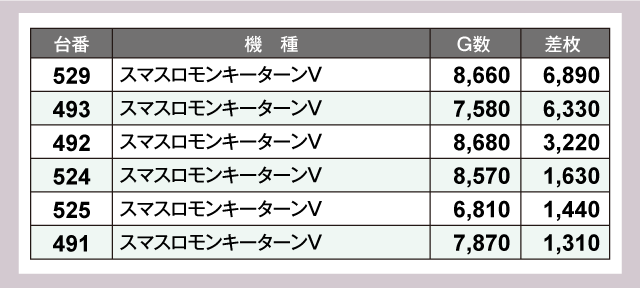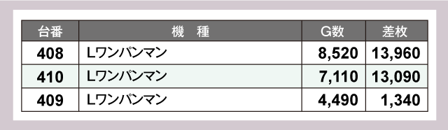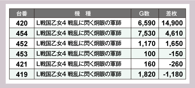 特に注目すべきは『Lワンパンマン』で、全3台中2台が万枚超を達成する活況っぷりを披露していた。さらに『L戦国乙女4 戦乱に閃く炯眼の軍師』も+14,900枚を記録、また『スマスロモンキーターンV』からは+6,000枚超が2台も発生する見事な結果を残している。
