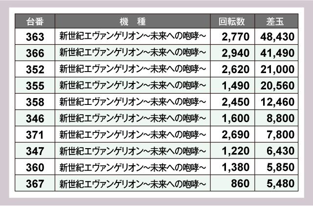 一方、パチンコも負けてはおらず『新世紀エヴァンゲリオン〜未来への咆哮〜』では万発超が続出。なかでも363番台と366番台が圧巻の40,000発超を叩き出しファンを喜ばせていた。