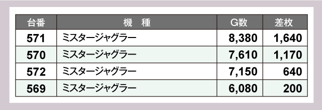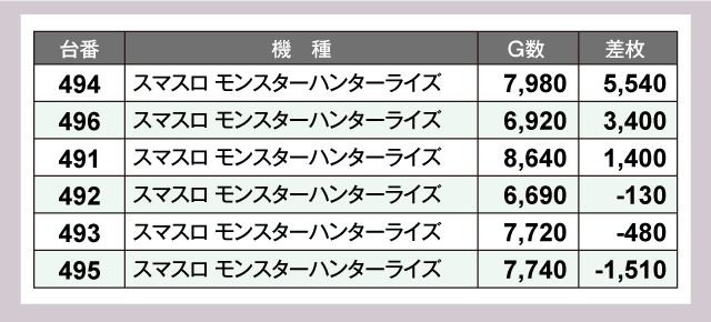 パチスロコーナーの状況を見ていくと、『スマスロ北斗の拳』が+4,050枚に+3,000枚超が3台と好成績を連発。また、『スマスロ モンスターハンターライズ』と『スマスロモンキーターンV』からはともに+5,000枚超が確認されている。さらに、『ミスタージャグラー』は全台がプラス差枚となっているだけに、ファンにとって充実の一日となったのは間違いないだろう。