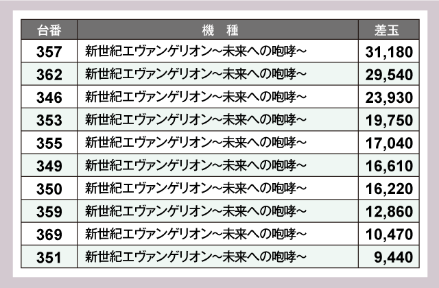 一方、パチンココーナーで最も目立っていたのが、未だ人気の衰え知らずな『新世紀エヴァンゲリオン〜未来への咆哮〜』。万発超が大量発生するなか、357番台が圧巻の+31,180発、362番台と346番台が+20,000発超といったハイスコアを叩き出しプレイヤーの注目を集めていた。