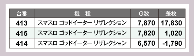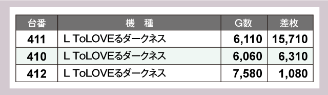 この日、パチスロコーナーで最もプレイヤーの注目を集めていたのが『L ToLOVEるダークネス』で、411番台が怒涛の+15,710枚を記録。しかも、最終的に設置されている3台全てがプラス差枚となる見事な結果を残しているだけに、ファンにとって充実の一日となったのは間違いないだろう。