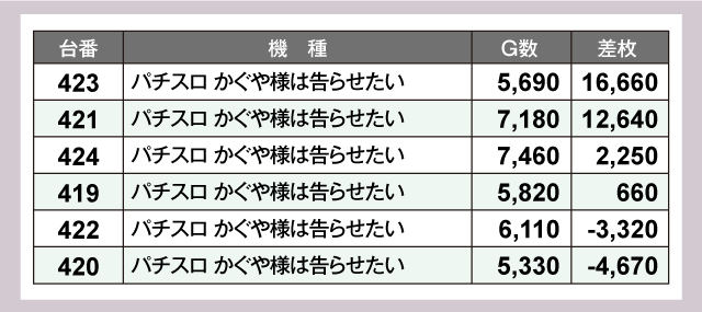 また、その他にも『スマスロ ゴッドイーター リザレクション』が+17,830枚、『パチスロ からくりサーカス』が+18,320枚、『L 東京喰種』が+13,350枚と様々な機種から好成績が発生。さらに、『パチスロ かぐや様は告らせたい』からは万枚超が2台も飛び出す盛況ぶりを見せ店内を盛り上げていた。