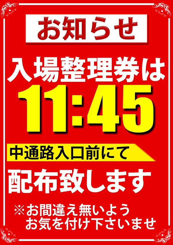 AM9:45から店舗横入口にてシャッフル整理券の配布を行います。 |
