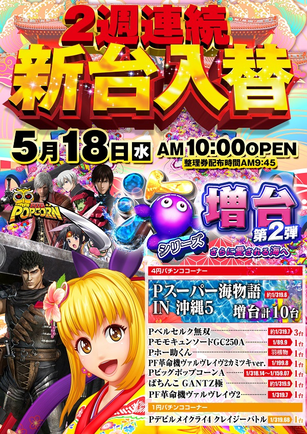 5月19日(木)新台入替完了!!夕方からもお待ちしております