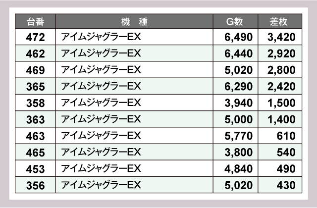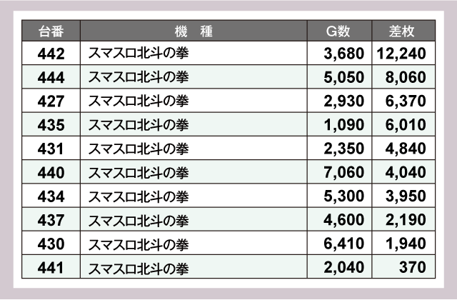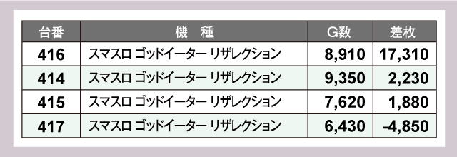 まず、パチスロコーナーをチェックしてみると『スマスロ北斗の拳』で+12,240枚、『スマスロ ゴッドイーター リザレクション』では+17,310枚を確認。また、『アイムジャグラーEX』も奮闘しており472番台が+3,420枚という見事な結果を残している。