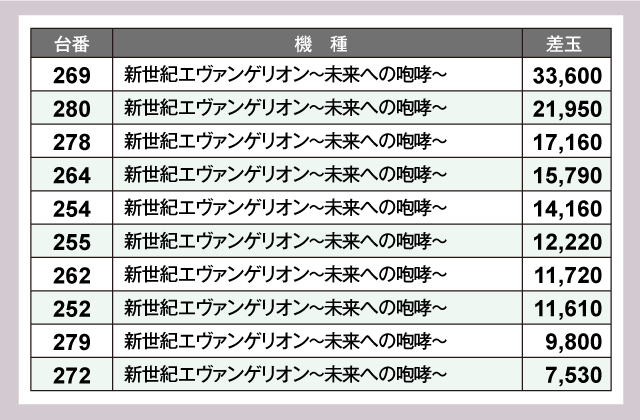 一方、パチンココーナーも負けてはおらず『新世紀エヴァンゲリオン〜未来への咆哮〜』で269番台の+33,600発を筆頭に万発超の台が大量発生!シマ中にファンの笑顔が溢れていた。