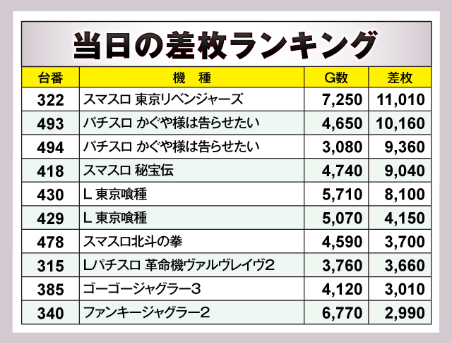 頭ひとつ抜けだしたのは『スマスロ 東京リベンジャーズ』。322番台が+11,010枚で首位を奪取している。そして『パチスロ かぐや様は告らせたい』493番台が+10,160枚、494番台が+9,360枚と驚異的な成績でつづいていた。以下にも『スマスロ 秘宝伝』418番台の+9,040枚などなど、誰もがうらやむ差枚が連なっていた。
