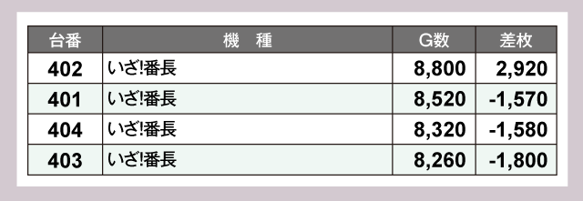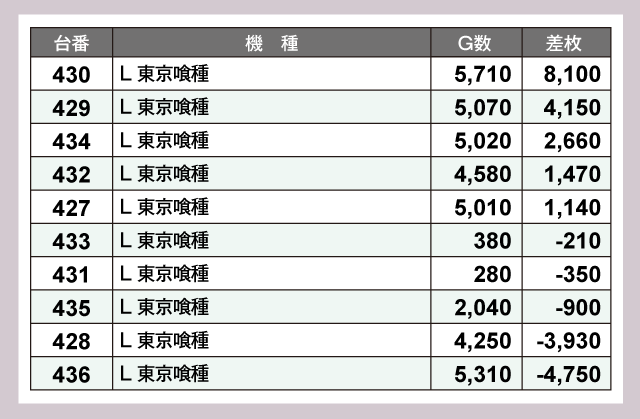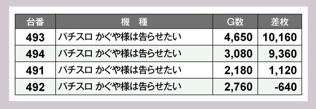 4台設置の『いざ!番長』はいずれも8,000G超えの高稼働。『パチスロ かぐや様は告らせたい』はトータルで+2万枚達成と素晴らしい結果を残していた。『L 東京喰種』は10台中5台がプラスで、トータルでも大きくプラスを叩きだしている。
