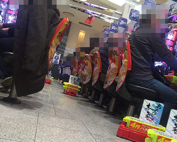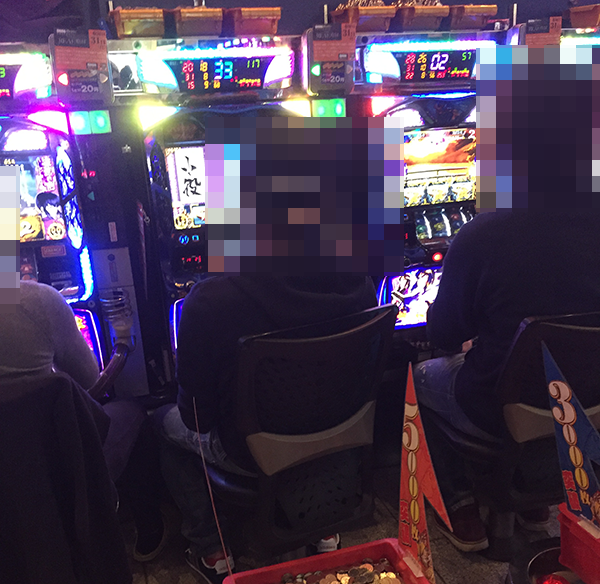 14時頃の20円パチスロをみると、「バジリスク~甲賀忍法帖~絆」がひときわ盛り上がっており、大満足といった表情のプレイヤーも多い。