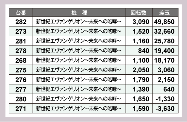 パチンココーナーも負けていない。『新世紀エヴァンゲリオン〜未来への咆哮〜』からは+40,000発が飛び出すなど、素晴らしい結果を残している。