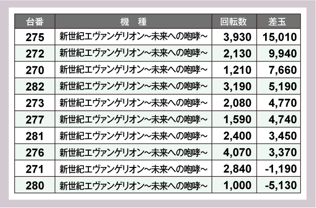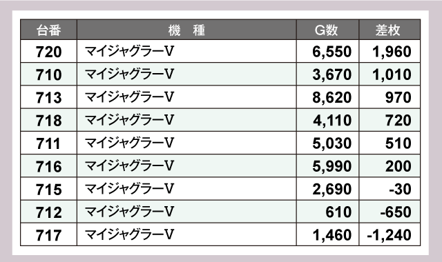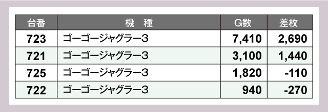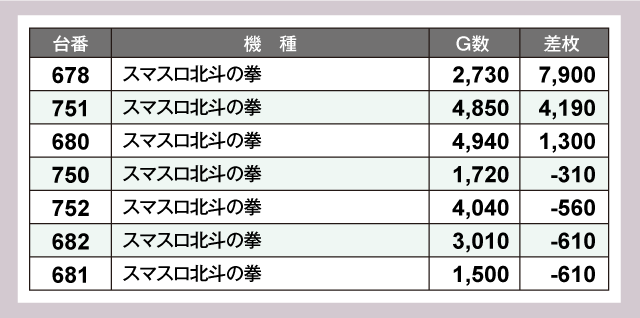 まずはパチスロの状況をチェックしてみると『スマスロ北斗の拳』の678番台が+7,900枚、751番台が+4,190枚を記録する活況っぷりであった。また『ゴーゴージャグラー3』は全4台中2台がプラスで終了、そのうちの1台は+2,690枚という見事な結果を残している。