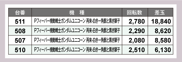 一方のパチンコは『Pフィーバー機動戦士ガンダムユニコーン 再来-白き一角獣と黒き獅子』が目立っており、+6,000発超が続出。なかでも511番台が圧巻の+18,840発を叩き出し店内を盛り上げていた。