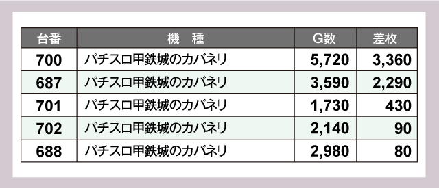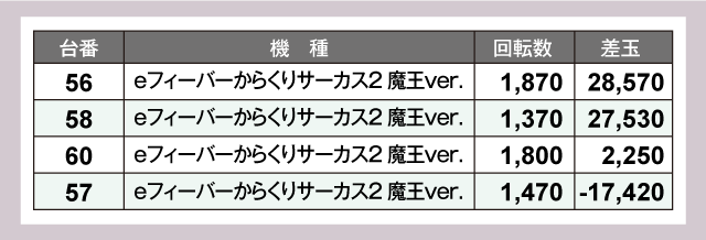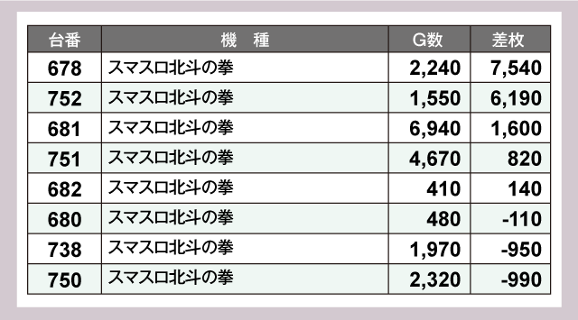 パチスロコーナーで最も注目を集めたのが『スマスロ北斗の拳』で、678番台が+7,540枚、752番台が+6,190枚といった見事な成績を残している。また、『パチスロ甲鉄城のカバネリ』からは+3,360枚が発生、しかも全ての台がプラス差枚で終了しているだけにファンにとっては充実した一日となっただろう。