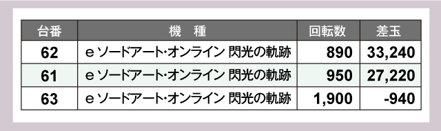 そして、パチンココーナーでは導入直後の新台『e ソードアート・オンライン 閃光の軌跡』が絶好調で、61番台が+27,220発、62番台が+33,240発と、そのポテンシャルの高さを早くもファンにアピールしていた。