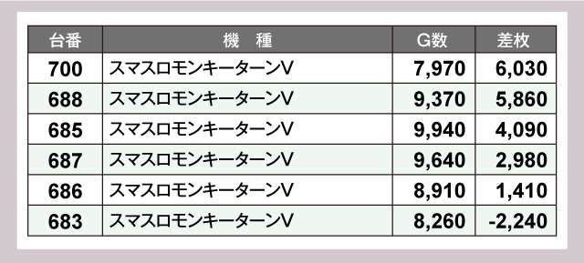 早速、店内状況をチェックすると、最も目立っていたのが『スマスロモンキーターンV』で、700番台が+6,030枚、688番台が+5,860枚といったハイスコアを連発。さらに、最終的に全6台中5台がプラス差枚となっているだけに、ファンにとって充実の一日になったのは間違いないだろう。