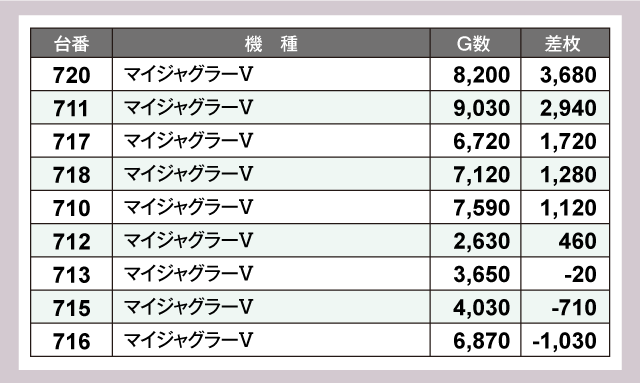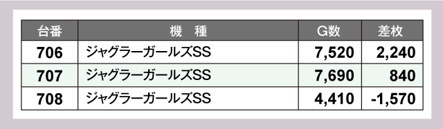 また、Aタイプではジャグラーシリーズが奮闘しており、『マイジャグラーⅤ』から+3,680枚、『ジャグラーガールズSS』からは+2,240枚を確認。しかも、両機種とも半数以上の台がプラス差枚で実戦を終えている。
