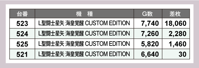特に圧巻だったのはパチスロコーナーの『L聖闘士星矢 海皇覚醒 CUSTOM EDITION』だ。なんと523番台は+18,000枚オーバーと驚愕の記録を残していた!