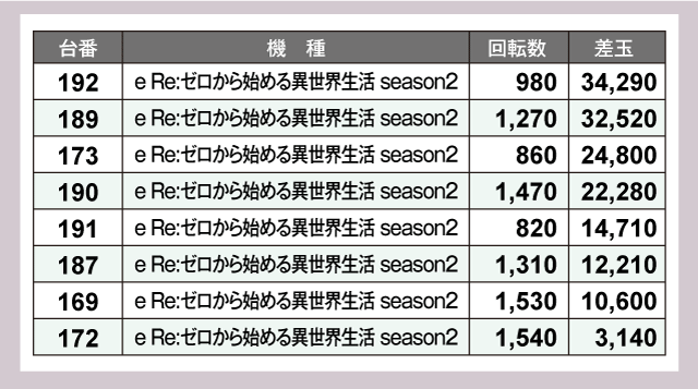 さらにパチンココーナーの盛り上がりも大きく、『Pスーパー海物語 IN 沖縄5』や『e Re:ゼロから始める異世界生活 season2』は、そこかしこに万発オーバーの優秀台が見受けられた。