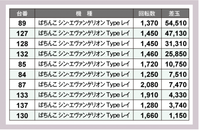 パチンコで圧巻だったのは『ぱちんこ シン・エヴァンゲリオン Type レイ』。89番台が+54,510発、127番台が+47,130発と誰もがうらやむほどの結果を残している。
