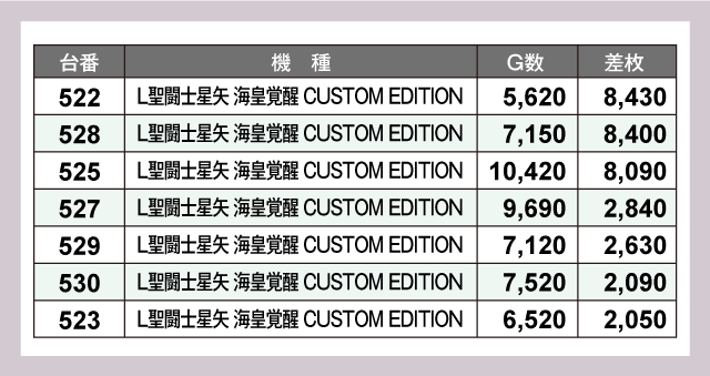 パチスロからは+6,000枚、+7,000枚が乱立。なかでも『L聖闘士星矢 海皇覚醒 CUSTOM EDITION』は、+8,000枚超えが3台も現れる大フィーバーとなった。