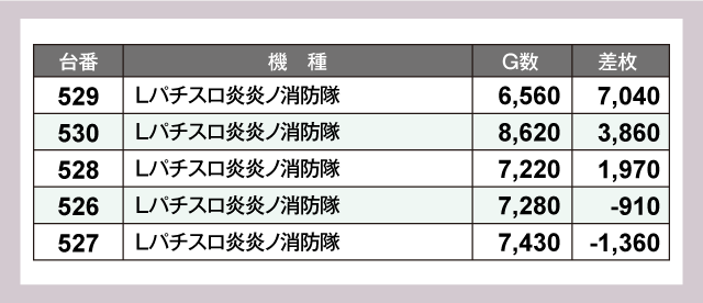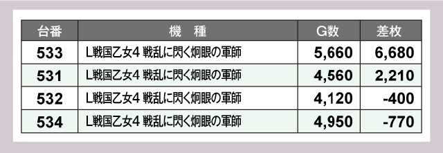 パチスロコーナーで結果を出したのは、『Lパチスロ炎炎ノ消防隊』529番台と『L戦国乙女4 戦乱に閃く炯眼の軍師』533番台。それぞれ+7,040枚、+6,680枚と大満足の差枚を残した。