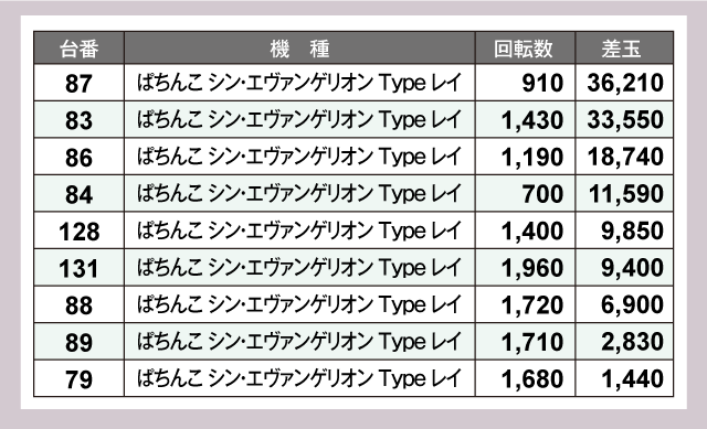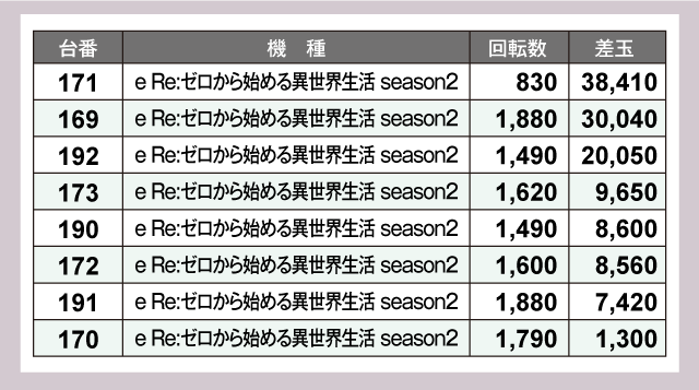 パチンココーナーでは『ぱちんこ シン・エヴァンゲリオン Type レイ』と『e Re:ゼロから始める異世界生活 season2』から、3万発超えがそれぞれ2台ずつ生まれている。