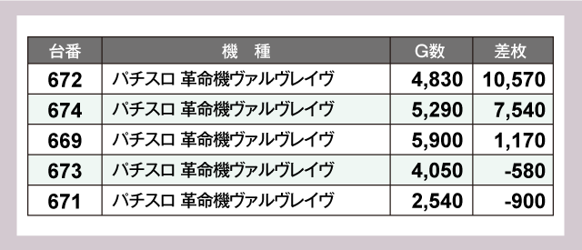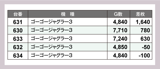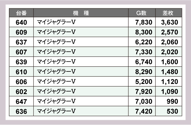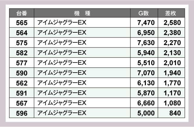 まず、パチスロをチェックしてみるとジャグラーシリーズが大奮闘!! 『アイムジャグラーEX』では+2,000枚超の台を多数確認、また『マイジャグラーⅤ』では640番台が+3,630枚を記録していた。