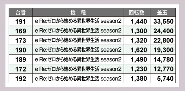 一方、パチンコは『e Re:ゼロから始める異世界生活 season2』で万発超が大量発生。特に191番台は驚異の+33,550発という見事な結果を残している。