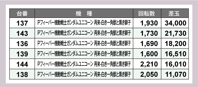 まず、パチスロコーナーをチェックしてみると『スマスロ北斗の拳』で+5,000枚超、『スマスロモンキーターンV』では+3,000枚超が複数台出現、定番人気のスマスロを中心に盛り上がりを見せていた。一方、パチンココーナーでは『Pフィーバー機動戦士ガンダムユニコーン 再来-白き一角獣と黒き獅子』で万発超が連発、特に137番台は驚異の+34,000発という見事な結果を残している。