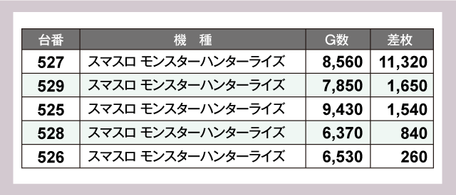 パチスロコーナーからは様々な機種で万枚超が発生、なかでも『スマスロモンキーターンV』からは+12,940枚に+10,720枚と2台も出現。また、『スマスロ ゴッドイーター リザレクション』では万枚超以外に+8,000枚超が連発している。