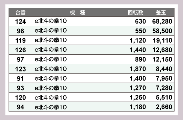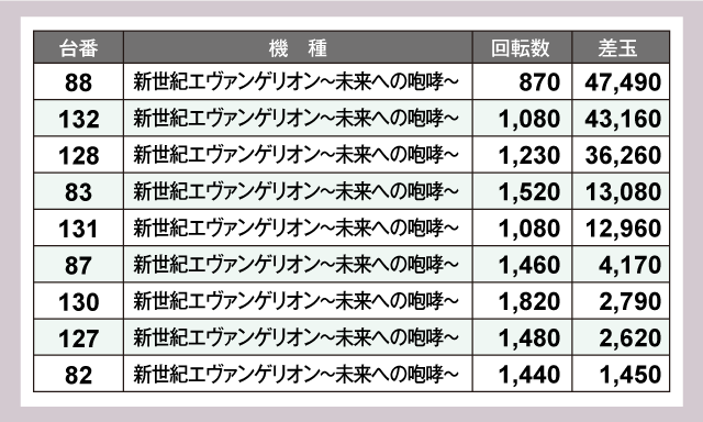 一方、パチンココーナーをチェックすると『新世紀エヴァンゲリオン〜未来への咆哮〜』で+40,000発超が2台、『e北斗の拳10』からは+68,280発に+58,500発と、定番の人気機種の活躍が特に目立っていた。