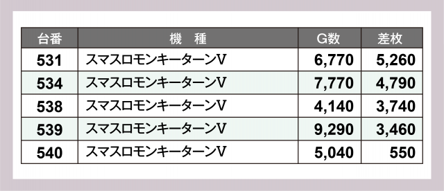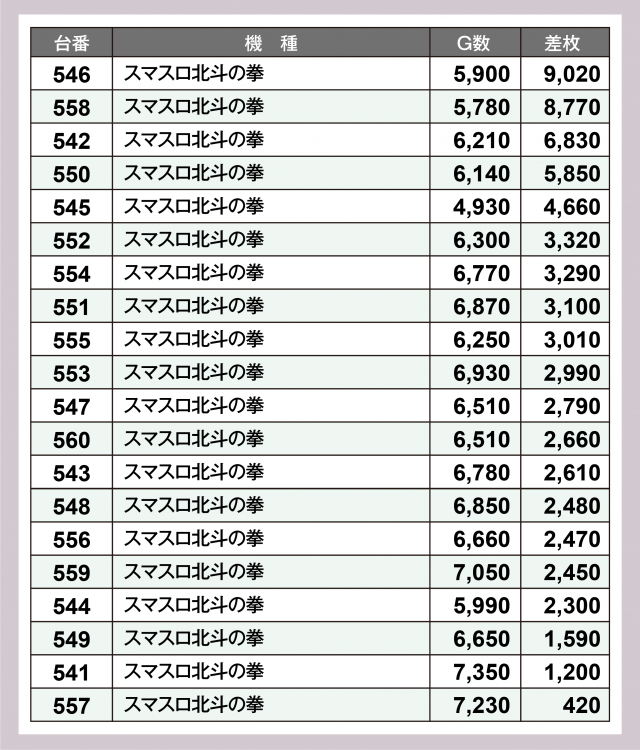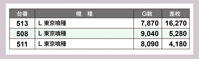 まず注目はパチスロ。設置20台の『スマスロ北斗の拳』は全台勝利の快挙を収め、うち19台が4桁プラス。546番台が万枚達成も見えるところまで迫っていた。その他にも『L 東京喰種』には+16,300枚弱のビッグヒット、『スマスロモンキーターンⅤ』にも優秀台が相次いだ。